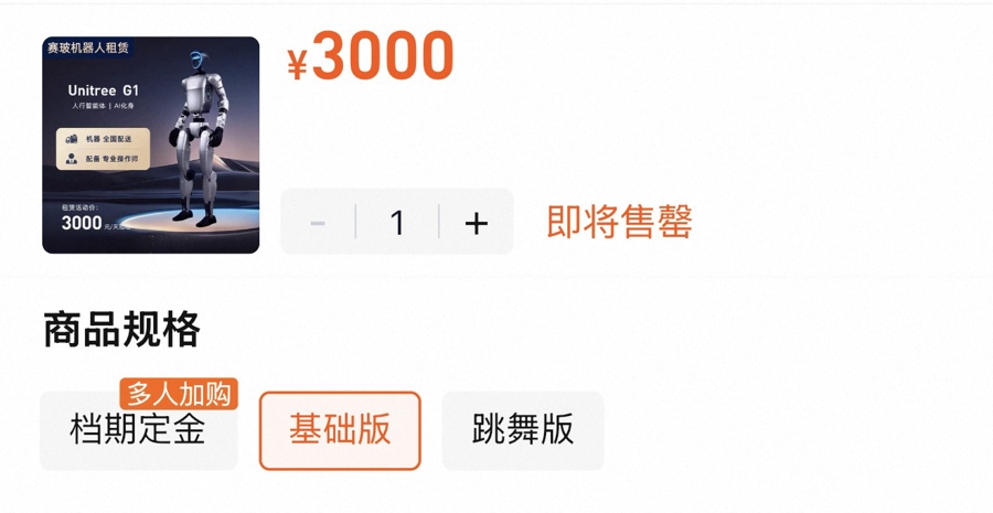 基础版机器人的日租金约3000元。