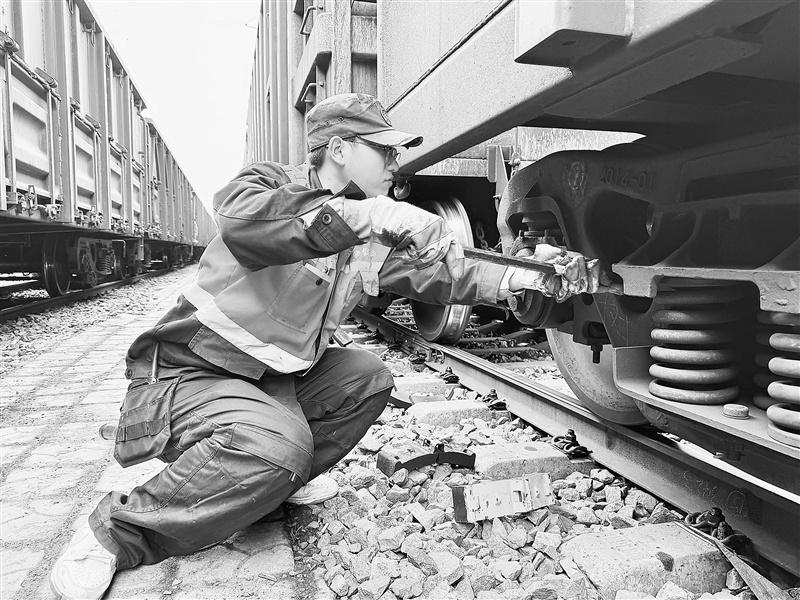 图为国铁太原局侯马北车辆段作业人员正在对C96型重载车辆进行检修作业。